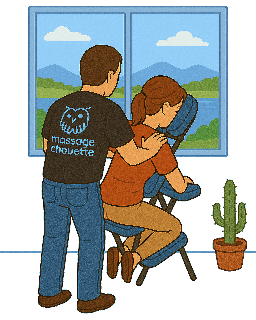 Chez Massage Chouette, nous vous proposons des massages sur chaise Amma, aussi appelés massages assis, dans un espace dédié au bien-être pour offrir à vos équipes une détente totale en toute simplicité.